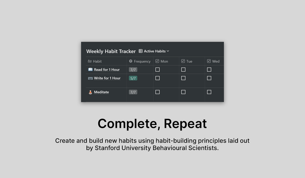 It sticks to the principles laid out by James Clear in his book Atomic Habits - that you shouldn't overload yourself by trying to build too many habits at once. In fact, the maximum you should try and build at once is three. That's according to BJ Fogg, behavioural scientist at Stanford University. Therefore, the Habit Tracker contains a Habits Backlog, where you can store the habits you would like to build at some point. You can also track your performance whilst building a habit, and see how building habits helps you hit your goals.